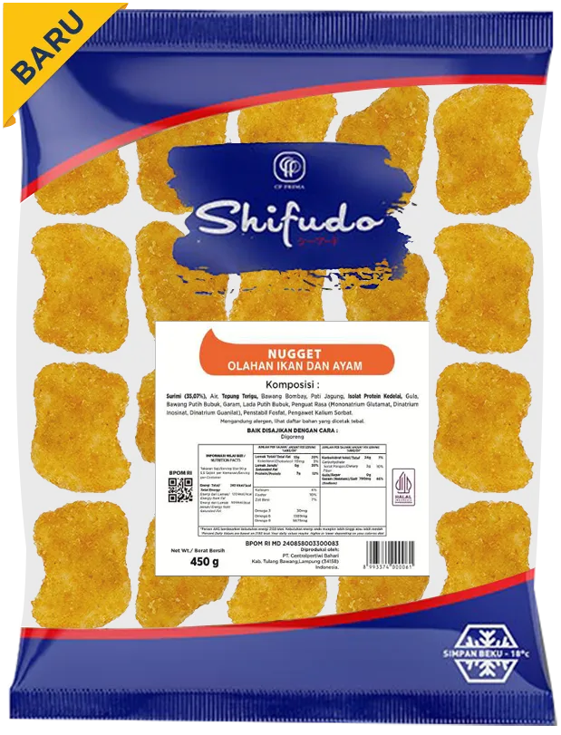 Shifudo Nugget terbuat dari perpaduan ikan dan ayam pilihan, menghadirkan tekstur lembut dan juicy dengan cita rasa bumbu yang lezat. Balutan tepung roti yang renyah memberikan sensasi kriuk yang khas di setiap gigitan. Selain nikmat, produk ini juga praktis dan mudah diolah untuk berbagai kebutuhan sajian.